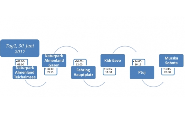 Die e-via 2017 präsentierte mit 36 E-Fahrzeugen und Fahrerteams ein breites Spektrum an markttauglichen Elektrofahrzeugen im Einsatz. Die 460 km lange Strecke startete am 30. Juni 2017 um 08:00 Uhr auf der Teichalm im Naturpark Almenland in der Oststeiermark und mit einem Zwischenstopp im Naturpark Almenland im Stoani Haus der Musik in Gasen sind die TeilnehmerInnen nach Fehring »gesegelt«, wie energiesparendes Fahren in E-Mobilitätskreisen bezeichnet wird. Der nächste offizielle Stopp wurde über den Landesgrenzen in Slowenien in Kidričevo eingelegt, wo auch schon ein herzhaftes Buffet wartete. Die letzten zwei Etappen des ersten Tages führten zuerst nach Ptuj und anschließend zum Tagesziel und der Übernachtung nach Murska Sobota.