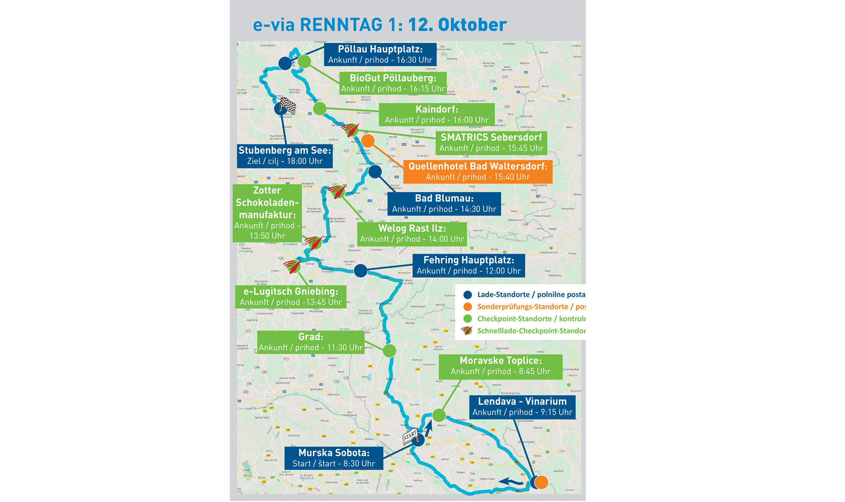 Am Freitag, den 12. Oktober 2018, war der offizielle Start des 1. Renn-Tages vor dem neuen regionalen Tourist-Informationszentrum EXPANO in Murska Sobota (SI)- die 36 e-via-E-Teams fuhren lautlos gesammelt nach Österreich, und übernachteten in Stubenberg am See (AT).