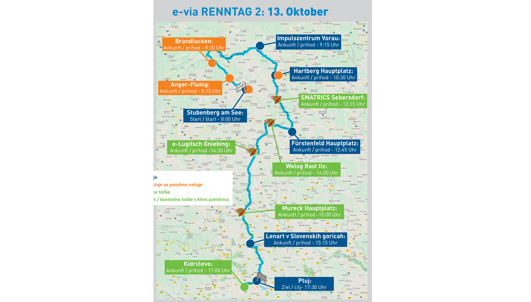 Die nun schon 4. Auflage der e-via - DIE ELEKTRORALLYE von 11. bis 13. Oktober 2018 bot auf ~600 km reinstes E-Fahr-Vergnügen durch die energiereiche Oststeiermark, die grüne Südoststeiermark und die schönen Regionen Pomurje und Spodnje Podravje in Slowenien. Auf der dreitägigen Reise beeindruckten abenteuerliche Prüfungen an den insgesamt 13 Lade-Standorten, 7 Sonderprüfungs-Standorten und 13 Checkpoint-Standorten die e-via E-Teams.
